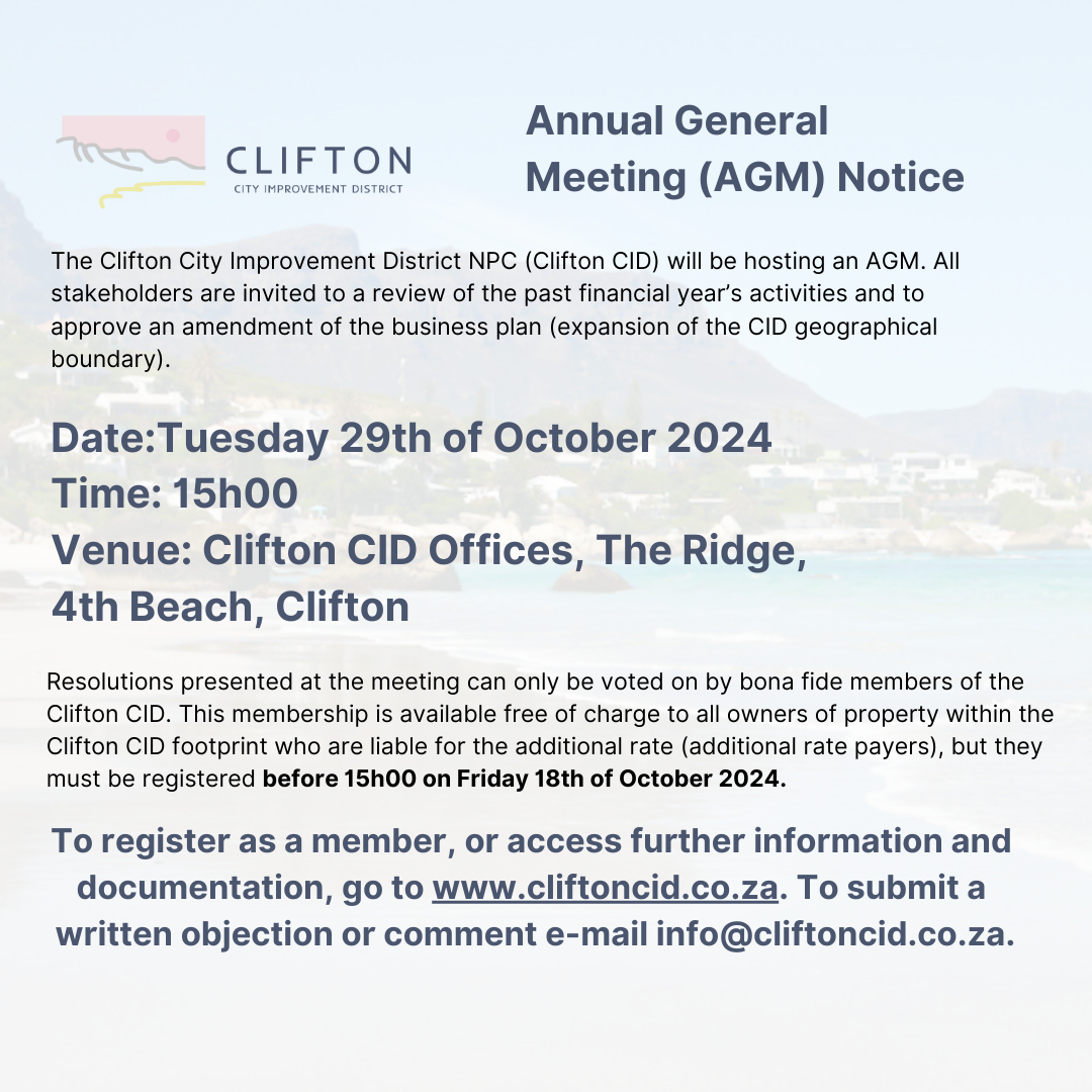 Our Annual General Meeting will take place on Tuesday 29th of October 2024 at 15h00 in the CID offices. Please visit https://www.cliftoncid.co.za/2024-agm/ for all relevant information and documents.